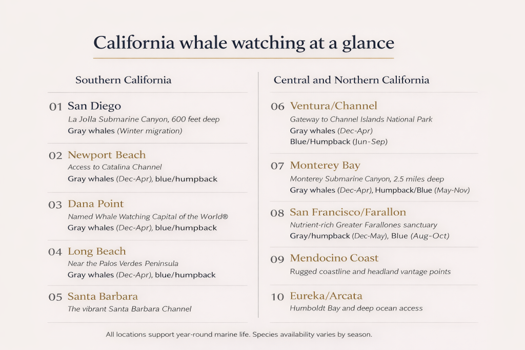 California’s whale watching corridor runs the full length of the coast and delivers a different experience depending on the season, the species, and how close you want to get. Every location on this list has a legitimate case for being the right choice under the right conditions.