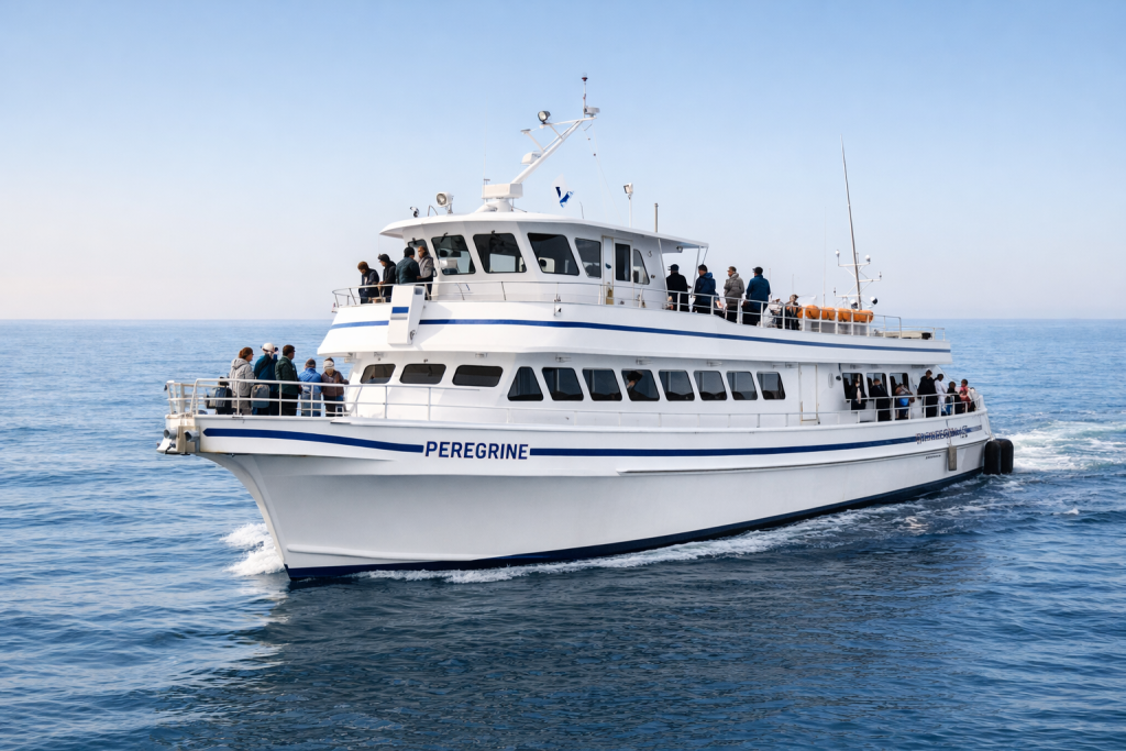 Wild Pacific Whale Watch operates the Peregrine, an 82-foot yacht with twin Tohmei anti-rolling gyro stabilizers, air-conditioned interior seating, a full galley, and a crew with over 40 years of combined experience in San Diego and Monterey Bay waters. Tours run three to three and a half hours year-round from H&M Landing near Shelter Island, minutes from San Diego International Airport. The experienced crew tracks real-time conditions and communicates with other operators on the water. The sightings log is updated regularly with current species activity.